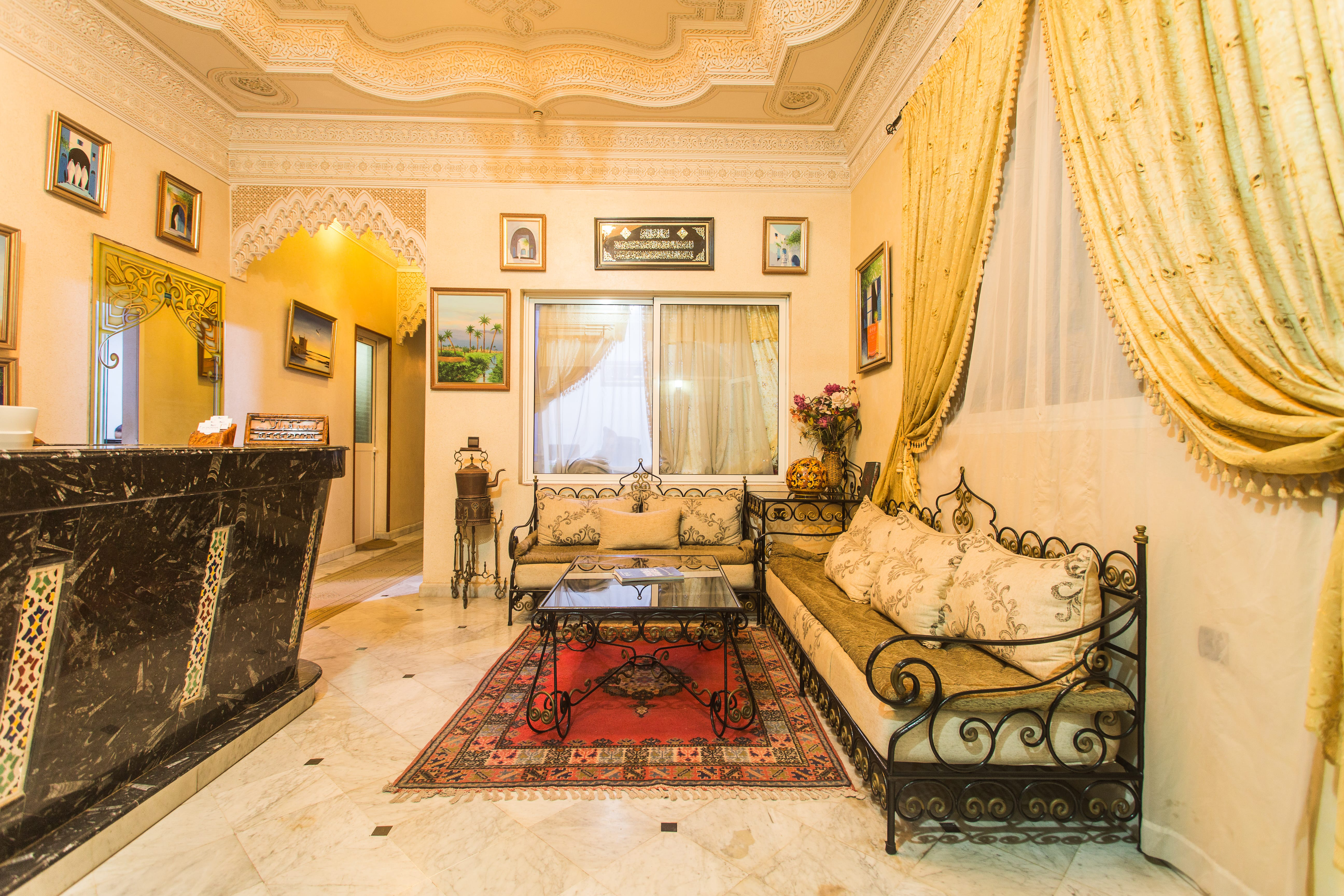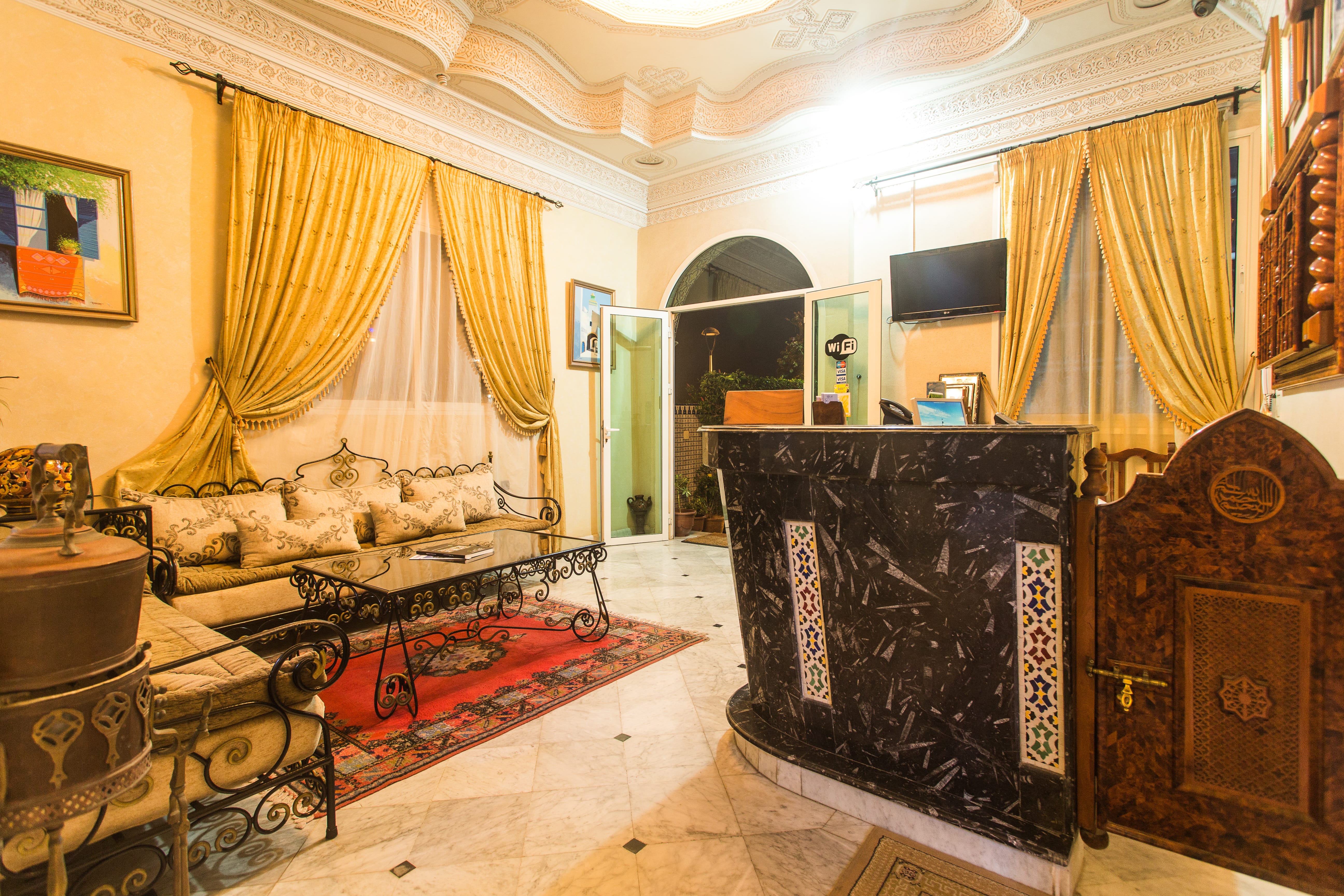 l'entrée de l'Hôtel Borj Mogador, au rez - de chaussée, le Hall de la réception vous accueille dans un cadre architectural purement artisanal ou, modernisme et traditions, s'allient pour créer un espace qui reflète à la fois le richesse des arts et métiers dans un style Marocco-Andalous (Arcades finement ciselées de mains de maître ) et la diversité du savoir-faire.